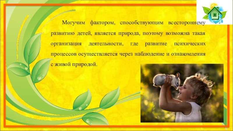 Слайд 10Могучим фактором, способствующим всестороннему развитию детей, является природа, поэтому возможна такая