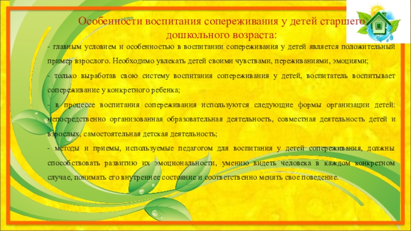 Слайд 9Особенности воспитания сопереживания у детей старшего дошкольного возраста:
