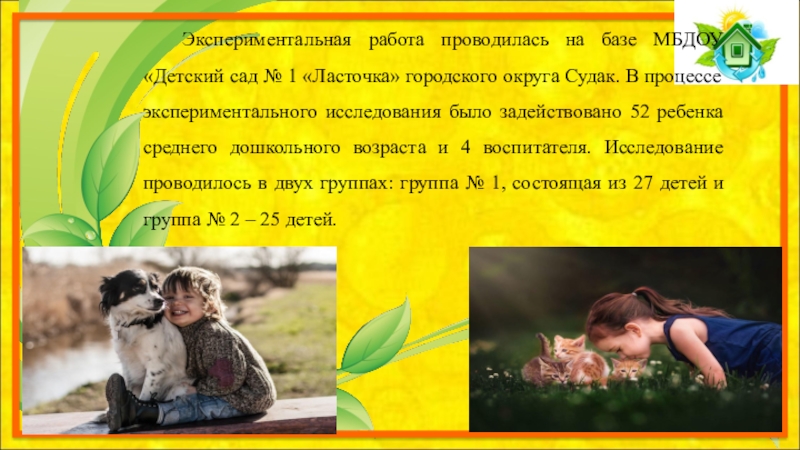 Слайд 12Экспериментальная работа проводилась на базе МБДОУ «Детский сад № 1 «Ласточка»