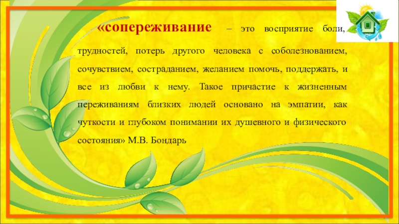 Слайд 7«сопереживание – это восприятие боли, трудностей, потерь другого человека с соболезнованием,