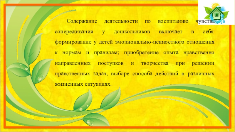 Слайд 8Содержание деятельности по воспитанию чувства сопереживания у дошкольников включает в себя