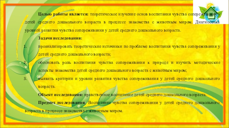 Предмет исследования: Воспитание чувства сопереживания у детей среднего дошкольного возраста в процессе знакомства с животным миром.