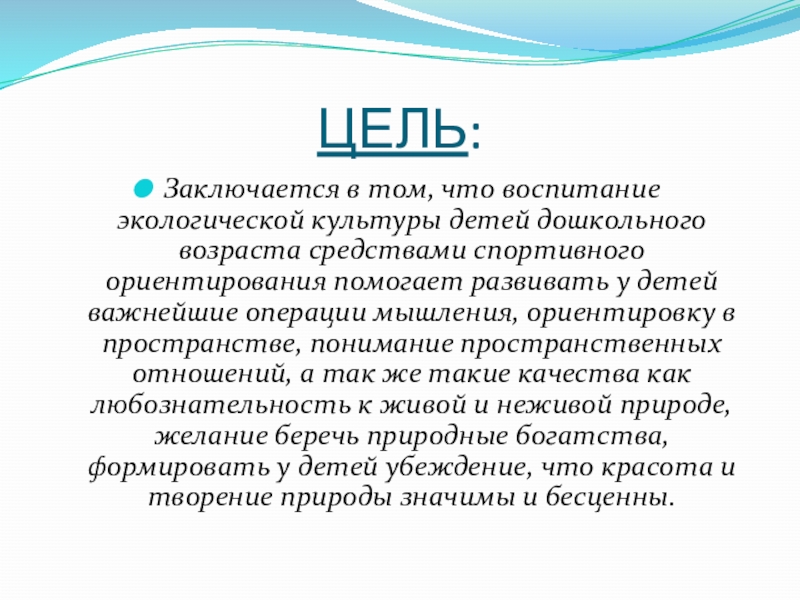 ЦЕЛЬ:Заключается в том, что воспитание экологической культуры детей дошкольного возраста средствами спортивного ориентирования помогает развивать у детей важнейшие операции мышления, ориентировку в пространстве, понимание пространственных отношений, а так же такие качества как любознательность к живой и