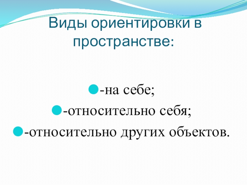 Виды ориентировки в пространстве:-на себе;-относительно себя;-относительно других объектов.