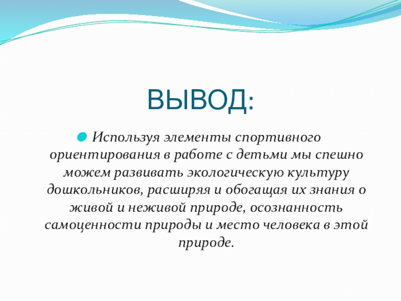 ВЫВОД:Используя элементы спортивного ориентирования в работе с детьми мы спешно можем развивать экологическую культуру дошкольников, расширяя и