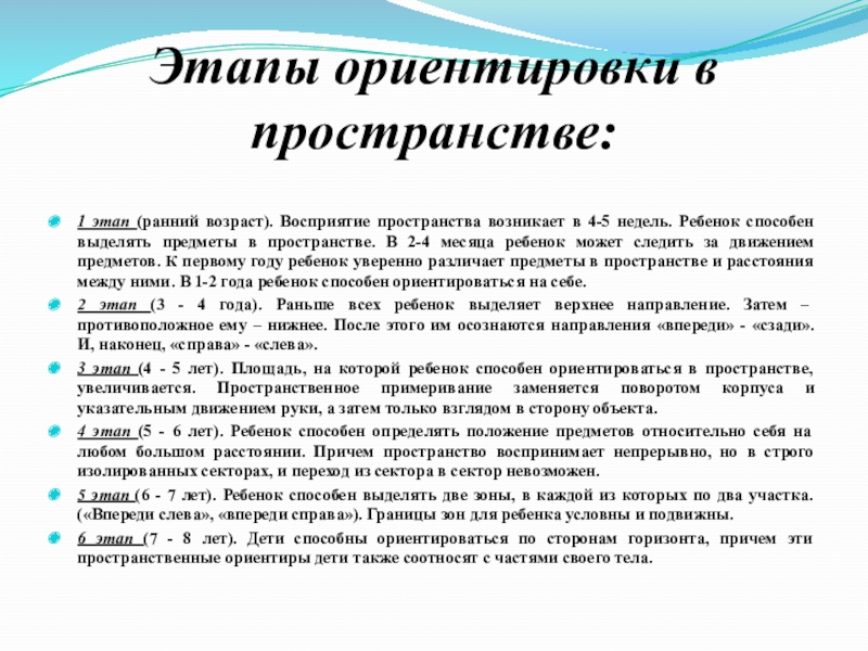 Этапы ориентировки в пространстве:1 этап (ранний возраст). Восприятие пространства возникает в 4-5 недель. Ребенок способен выделять предметы
