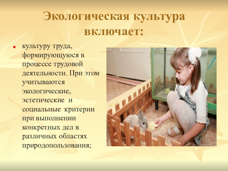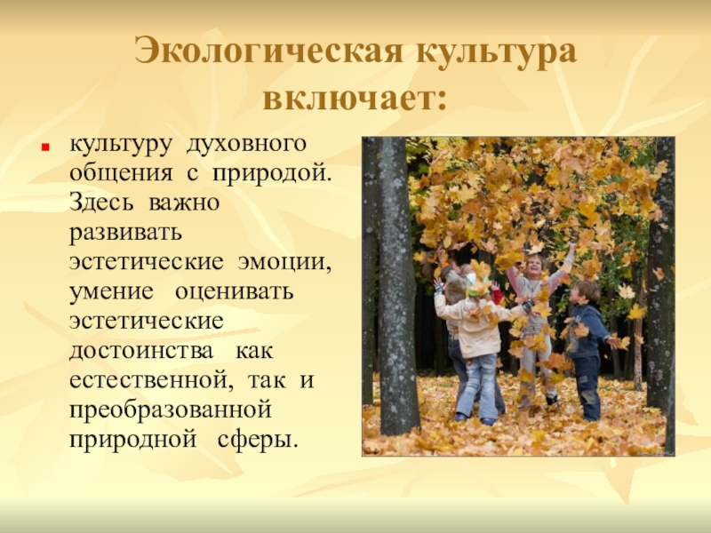Слайд 9Экологическая культура включает в себя следующие элементы: