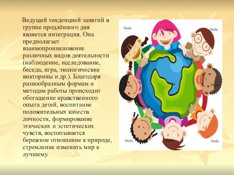 интеграция. Она предполагает взаимопроникновение различных видов деятельности (наблюдение, исследование, беседа, игра, экологические викторины и др.). Благодаря разнообразным формам и методам работы происходит обогащение нравственного опыта детей, воспитание положительных качеств личности, формирование этических и эстетических чувств, воспитывается бережное отношение к природе, стремление изменить мир к лучшему.