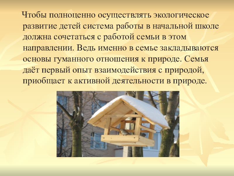 начальной школе должна сочетаться с работой семьи в этом направлении. Ведь именно в семье закладываются основы гуманного отношения к природе. Семья даёт первый опыт взаимодействия с природой, приобщает к активной деятельности в природе.