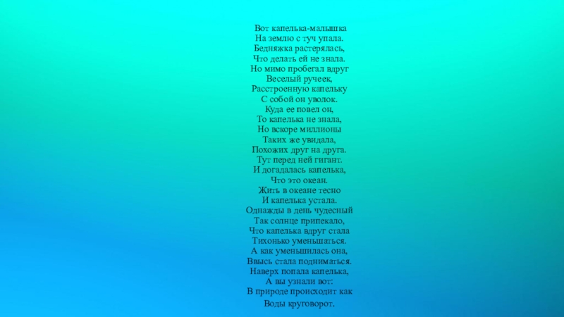 знала. Но мимо пробегал вдруг Веселый ручеек, Расстроенную капельку С собой он уволок. Куда ее повел он, То капелька не знала, Но вскоре миллионы Таких же увидала, Похожих друг на друга. Тут перед ней гигант. И догадалась капелька, Что это океан. Жить в океане тесно И капелька устала. Однажды в день чудесный Так солнце припекало, Что капелька вдруг стала Тихонько уменьшаться. А как уменьшилась она, Ввысь стала подниматься. Наверх попала капелька, А вы узнали вот: В природе происходит как Воды круговорот.