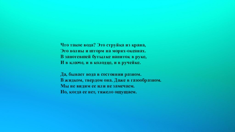 Что такое вода? Это струйка из крана, Это волны и шторм на морях-океанах. В запотевшей бутылке напиток в руке, И в ключе, и в колодце, и в ручейке. Да, бывает вода в состоянии разном. В