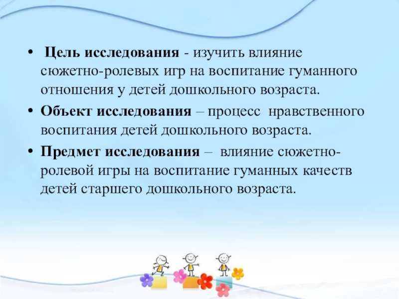 Предмет исследования – влияние сюжетно-ролевой игры на воспитание гуманных качеств детей старшего дошкольного возраста.