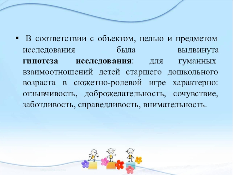 гипотеза исследования: для гуманных взаимоотношений детей старшего дошкольного возраста в сюжетно-ролевой игре характерно: отзывчивость, доброжелательность, сочувствие, заботливость, справедливость, внимательность.