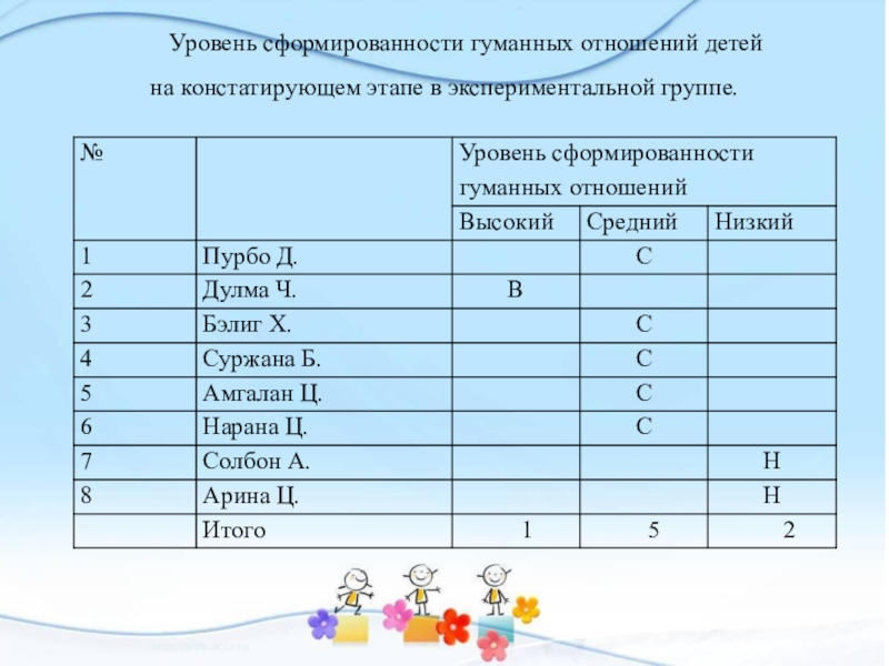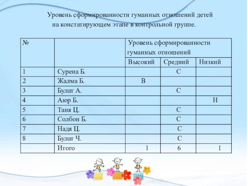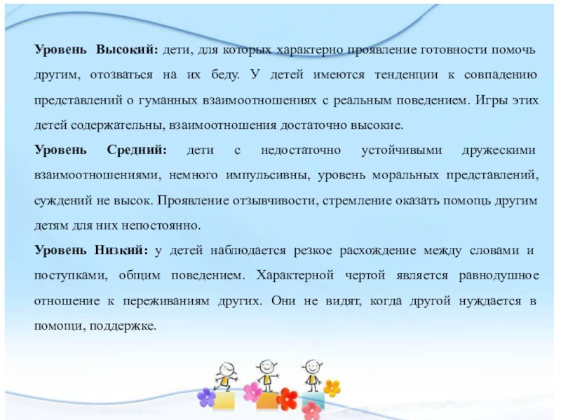 Уровень Низкий: у детей наблюдается резкое расхождение между словами и поступками, общим поведением. Характерной чертой является равнодушное отношение к переживаниям других. Они не видят, когда другой нуждается в помощи, поддержке.