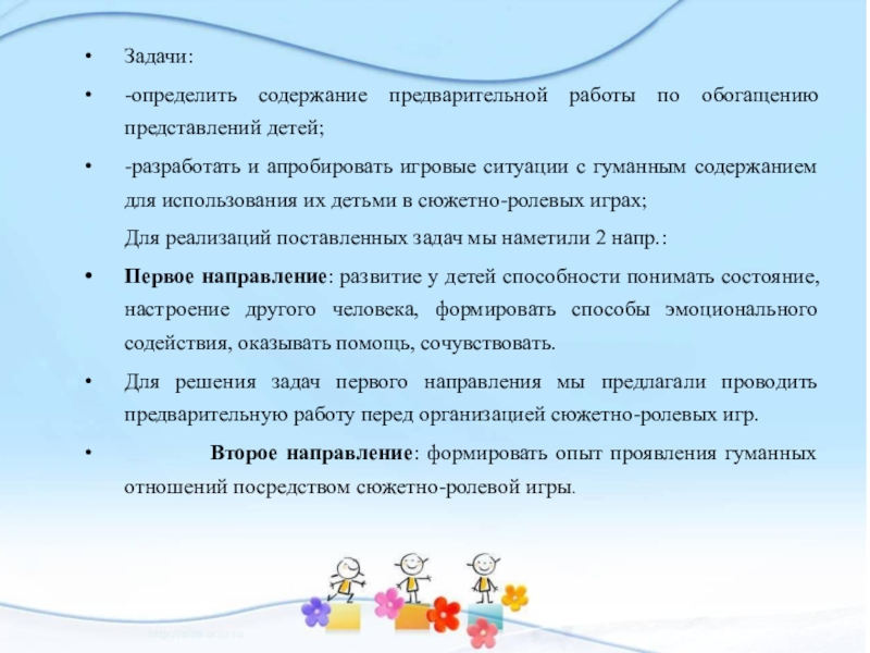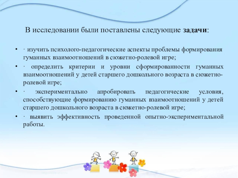 · экспериментально апробировать педагогические условия, способствующие формированию гуманных взаимоотношений у детей старшего дошкольного возраста в сюжетно-ролевой игре;