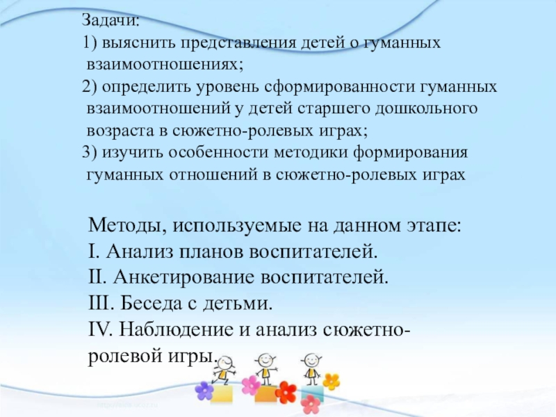 3) изучить особенности методики формирования гуманных отношений в сюжетно-ролевых играх