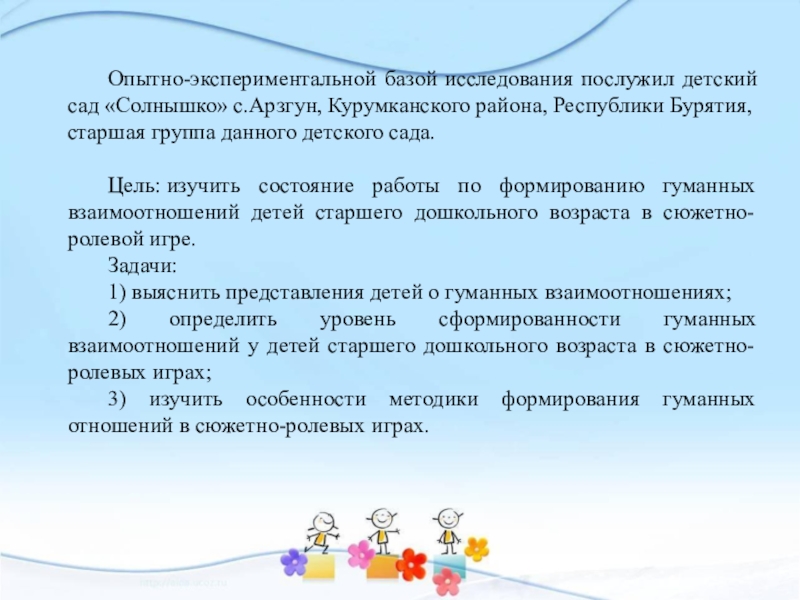 Опытно-экспериментальной базой исследования послужил детский сад «Солнышко» с.Арзгун, Курумканского района, Республики