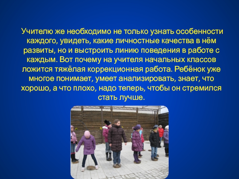 личностные качества в нём развиты, но и выстроить линию поведения в работе с каждым. Вот почему на учителя начальных классов ложится тяжёлая коррекционная работа. Ребёнок уже многое понимает, умеет анализировать, знает, что хорошо, а что плохо, надо теперь, чтобы он стремился стать лучше.