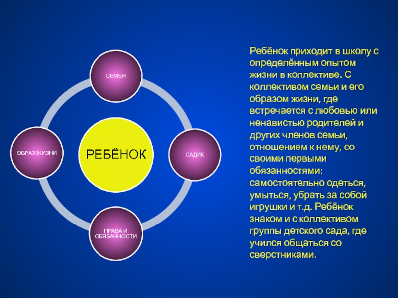 Ребёнок приходит в школу с определённым опытом жизни в коллективе. С коллективом семьи и его образом жизни,