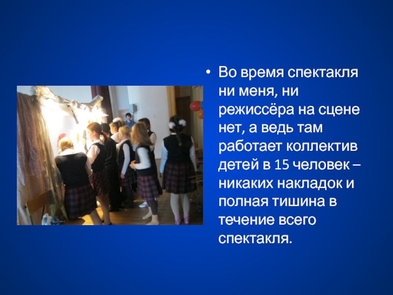 Слайд 6Во время спектакля ни меня, ни режиссёра на сцене нет, а