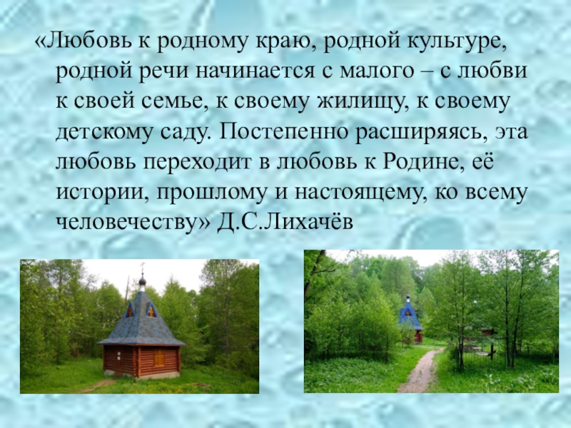 – с любви к своей семье, к своему жилищу, к своему детскому саду. Постепенно расширяясь, эта любовь переходит в любовь к Родине, её истории, прошлому и настоящему, ко всему человечеству» Д.С.Лихачёв