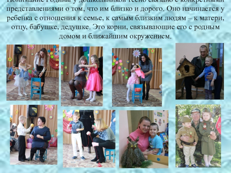 что им близко и дорого. Оно начинается у ребенка с отношения к семье, к самым близким людям – к матери, отцу, бабушке, дедушке. Это корни, связывающие его с родным домом и ближайшим окружением.