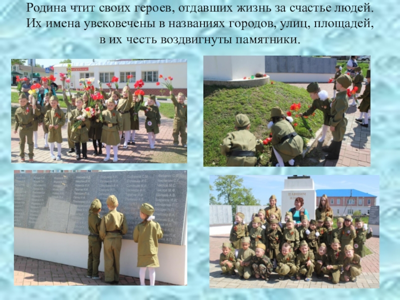 Слайд 45Родина чтит своих героев, отдавших жизнь за счастье людей. Их имена