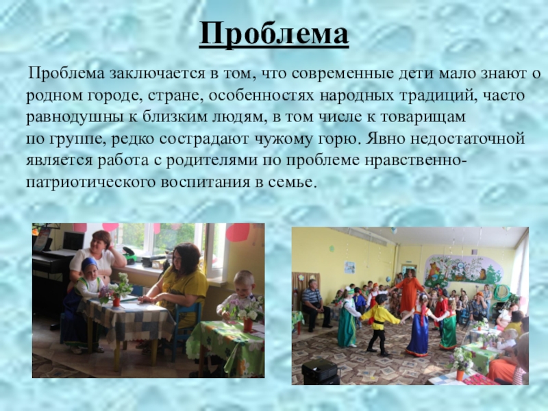 знают о родном городе, стране, особенностях народных традиций, часто равнодушны к близким людям, в том числе к товарищам по группе, редко сострадают чужому горю. Явно недостаточной является работа с родителями по проблеме нравственно-патриотического воспитания в семье.