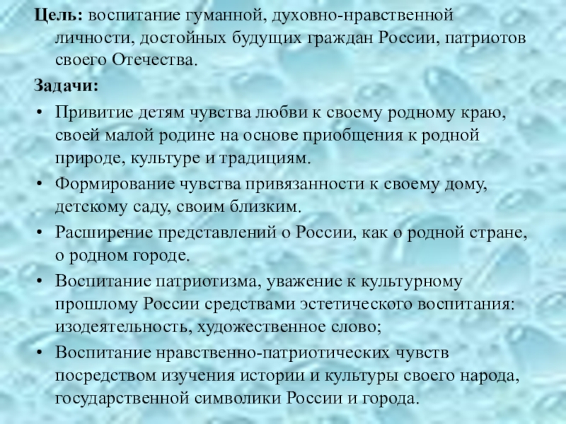Воспитание нравственно-патриотических чувств посредством изучения истории и культуры своего народа, государственной символики России и города.