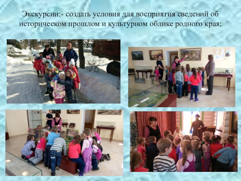 Слайд 28Экскурсии:- создать условия для восприятия сведений об историческом прошлом и культурном облике родного края;