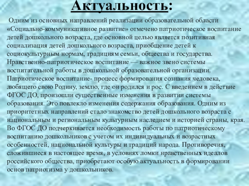 развитие» отмечено патриотическое воспитание детей дошкольного возраста, где основной целью является позитивная социализация детей дошкольного возраста, приобщение детей к социокультурным нормам, традициям семьи, общества и государства. Нравственно-патриотическое воспитание — важное звено системы воспитательной работы в дошкольной образовательной организации. Патриотическое воспитание- процесс формирования сознания человека, любящего свою Родину, землю, где он родился и рос. С введением в действие ФГОС ДО, произошли существенные изменения в развитии системы образования. Это повлекло изменения содержания образования. Одним из приоритетных направлений стало знакомство детей дошкольного возраста с национальным и региональным культурным наследием и историей страны, края. Во ФГОС ДО подчеркивается необходимость работы по патриотическому воспитанию дошкольников с учетом их индивидуальных и возрастных особенностей, национальной культуры и традиций народа. Противоречия, сложившиеся в настоящее время, в условиях ломки нравственных идеалов российского общества, приобретают особую актуальность в формировании основ патриотизма у дошкольников.