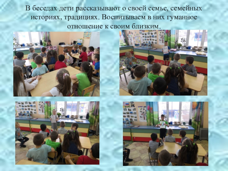 Слайд 20В беседах дети рассказывают о своей семье, семейных историях, традициях. Воспитываем