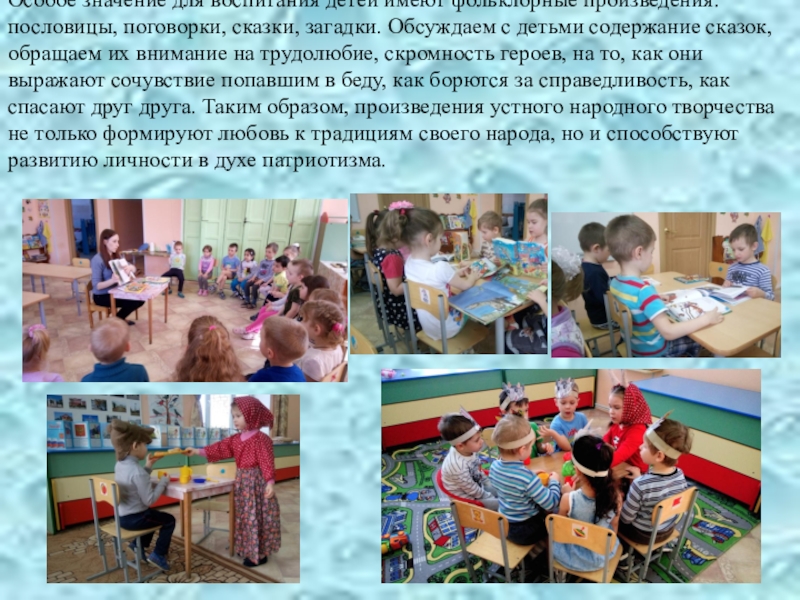 загадки. Обсуждаем с детьми содержание сказок, обращаем их внимание на трудолюбие, скромность героев, на то, как они выражают сочувствие попавшим в беду, как борются за справедливость, как спасают друг друга. Таким образом, произведения устного народного творчества не только формируют любовь к традициям своего народа, но и способствуют развитию личности в духе патриотизма.