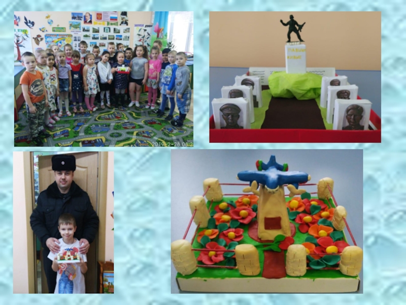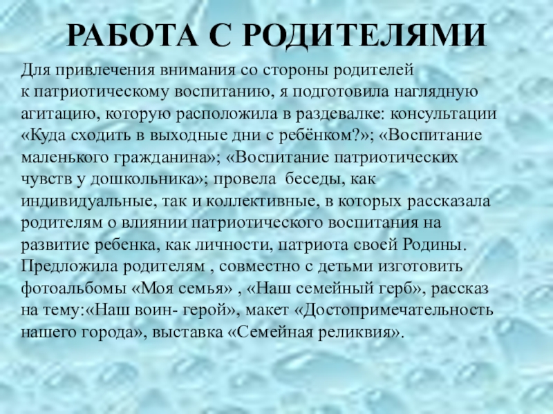 подготовила наглядную агитацию, которую расположила в раздевалке: консультации «Куда сходить в выходные дни с ребёнком?»; «Воспитание маленького гражданина»; «Воспитание патриотических чувств у дошкольника»; провела беседы, как индивидуальные, так и коллективные, в которых рассказала родителям о влиянии патриотического воспитания на развитие ребенка, как личности, патриота своей Родины. Предложила родителям , совместно с детьми изготовить фотоальбомы «Моя семья» , «Наш семейный герб», рассказ на тему:«Наш воин- герой», макет «Достопримечательность нашего города», выставка «Семейная реликвия».