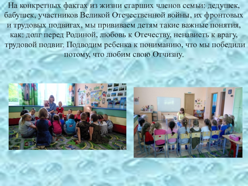 Великой Отечественной войны, их фронтовых и трудовых подвигах, мы прививаем детям такие важные понятия, как: долг перед Родиной, любовь к Отечеству, ненависть к врагу, трудовой подвиг. Подводим ребенка к пониманию, что мы победили потому, что любим свою Отчизну.