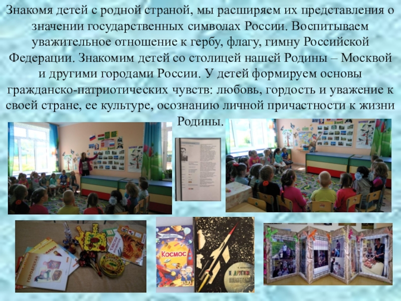 государственных символах России. Воспитываем уважительное отношение к гербу, флагу, гимну Российской Федерации. Знакомим детей со столицей нашей Родины – Москвой и другими городами России. У детей формируем основы гражданско-патриотических чувств: любовь, гордость и уважение к своей стране, ее культуре, осознанию личной причастности к жизни Родины.
