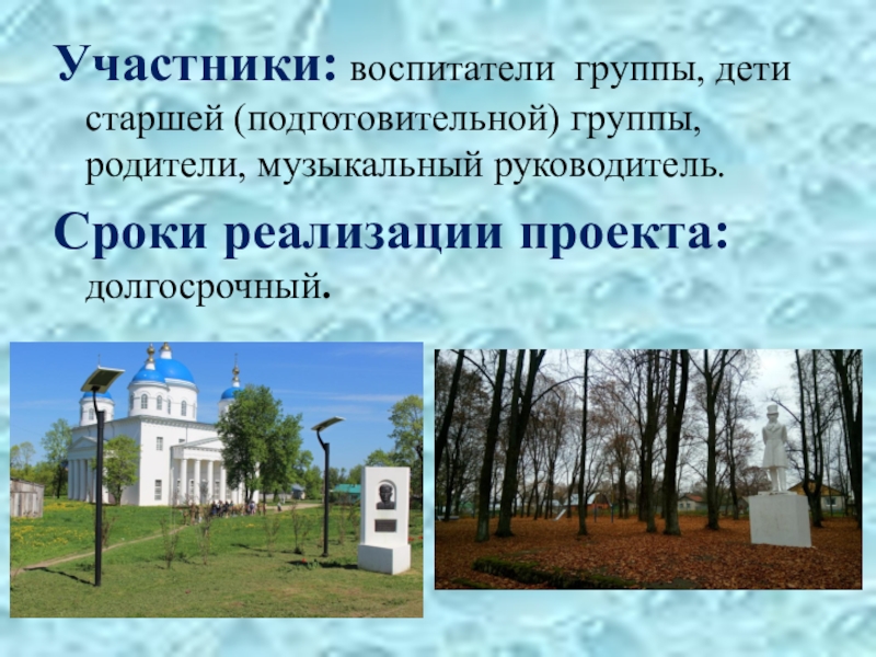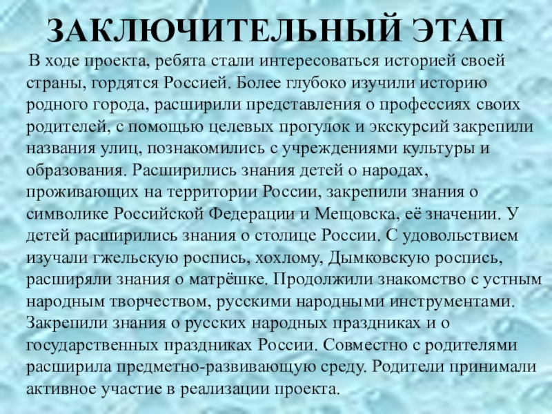 своей страны, гордятся Россией. Более глубоко изучили историю родного города, расширили представления о профессиях своих родителей, с помощью целевых прогулок и экскурсий закрепили названия улиц, познакомились с учреждениями культуры и образования. Расширились знания детей о народах, проживающих на территории России, закрепили знания о символике Российской Федерации и Мещовска, её значении. У детей расширились знания о столице России. С удовольствием изучали гжельскую роспись, хохлому, Дымковскую роспись, расширяли знания о матрёшке. Продолжили знакомство с устным народным творчеством, русскими народными инструментами. Закрепили знания о русских народных праздниках и о государственных праздниках России. Совместно с родителями расширила предметно-развивающую среду. Родители принимали активное участие в реализации проекта.
