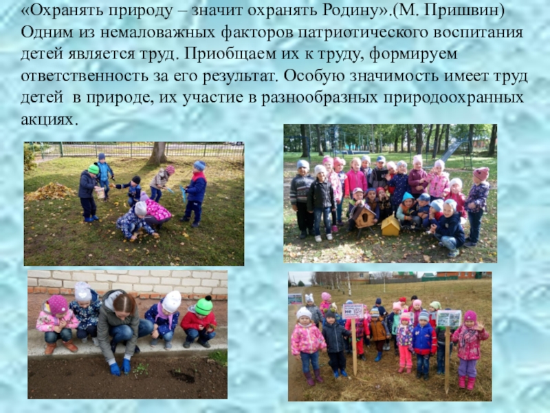воспитания детей является труд. Приобщаем их к труду, формируем ответственность за его результат. Особую значимость имеет труд детей в природе, их участие в разнообразных природоохранных акциях.