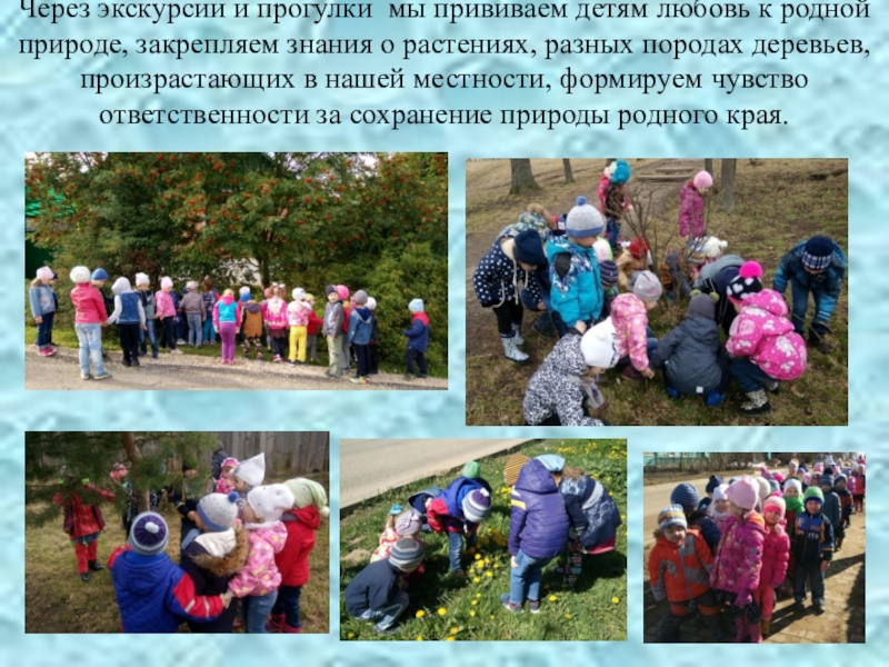 Слайд 22Через экскурсии и прогулки мы прививаем детям любовь к родной природе,
