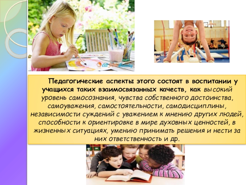 Слайд 6Педагогические аспекты этого состоят в воспитании у учащихся таких взаимосвязанных качеств,