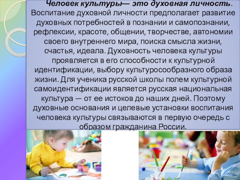 потребностей в познании и самопознании, рефлексии, красоте, общении, творчестве, автономии своего внутреннего мира, поиска смысла жизни, счастья, идеала. Духовность человека культуры проявляется в его способности к культурной идентификации, выбору культуросообразного образа жизни. Для ученика русской школы полем культурной самоидентификации является русская национальная культура — от ее истоков до наших дней. Поэтому духовные основания и целевые установки воспитания человека культуры связываются в первую очередь с образом гражданина России.