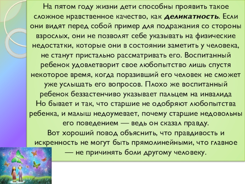 Слайд 12На пятом году жизни дети способны проявить такое сложное нравственное качество,