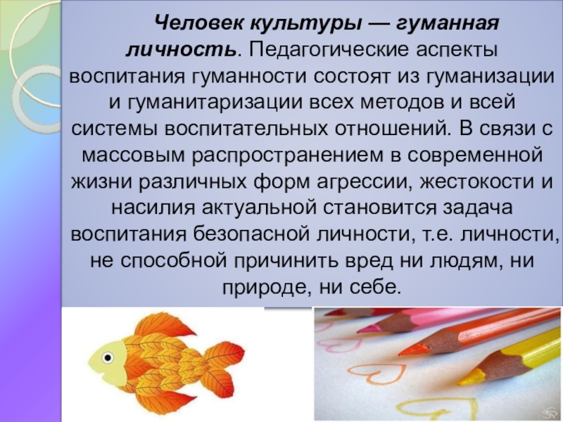 гуманизации и гуманитаризации всех методов и всей системы воспитательных отношений. В связи с массовым распространением в современной жизни различных форм агрессии, жестокости и насилия актуальной становится задача воспитания безопасной личности, т.е. личности, не способной причинить вред ни людям, ни природе, ни себе.