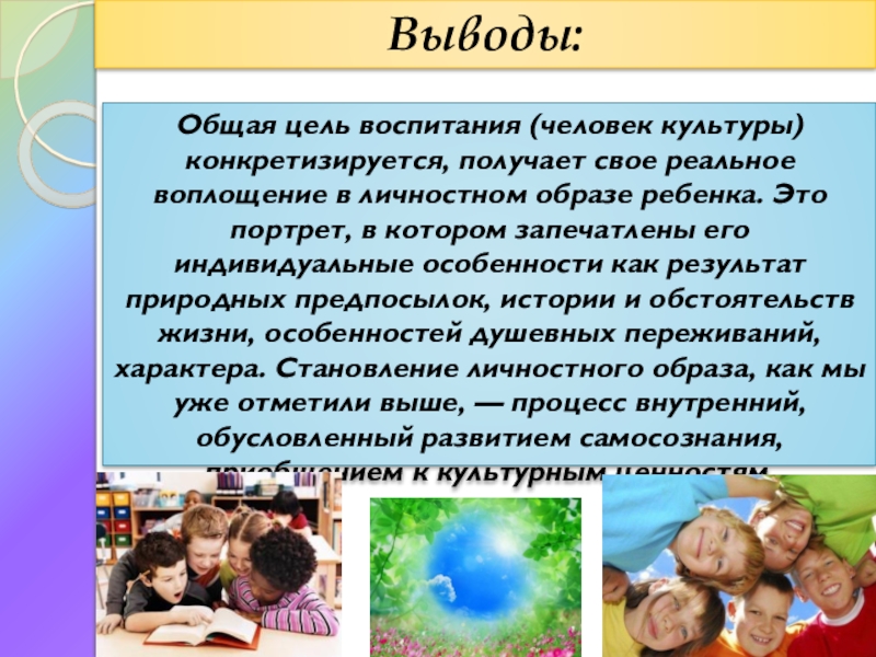 личностном образе ребенка. Это портрет, в котором запечатлены его индивидуальные особенности как результат природных предпосылок, истории и обстоятельств жизни, особенностей душевных переживаний, характера. Становление личностного образа, как мы уже отметили выше, — процесс внутренний, обусловленный развитием самосознания, приобщением к культурным ценностям.