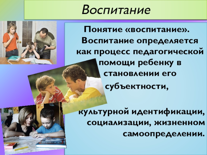 Слайд 3Понятие «воспитание». Воспитание определяется как процесс педагогической помощи ребенку в становлении