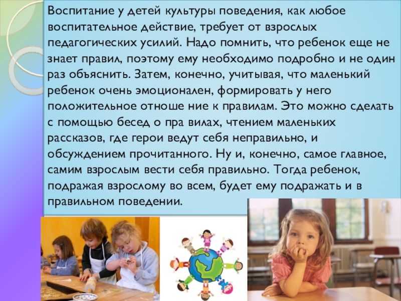 Слайд 14Воспитание у детей культуры поведения, как любое воспитательное действие, требует от