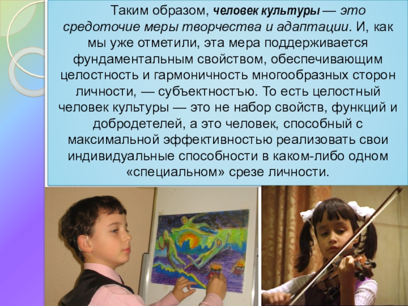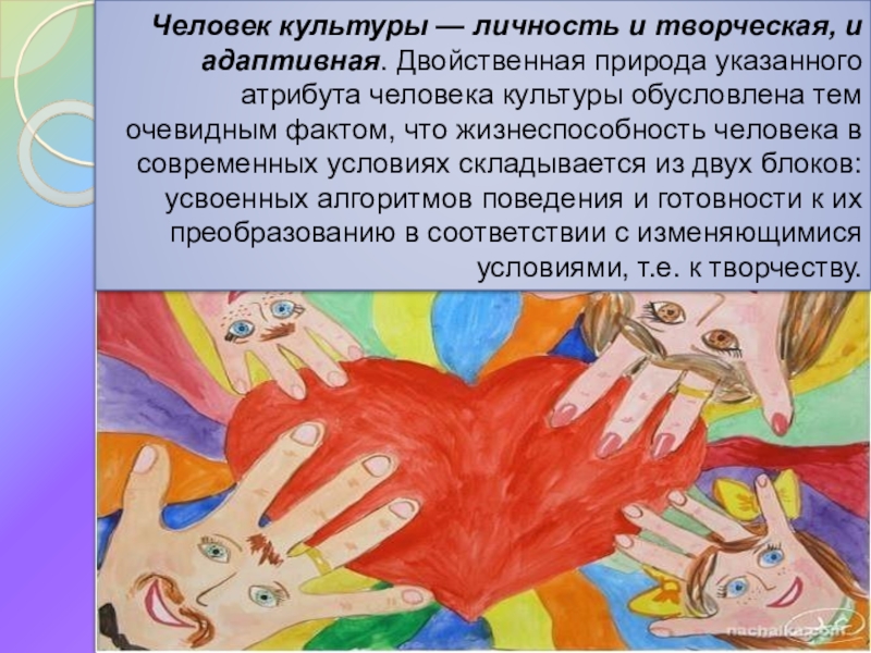 Слайд 10Человек культуры — личность и творческая, и адаптивная. Двойственная природа указанного
