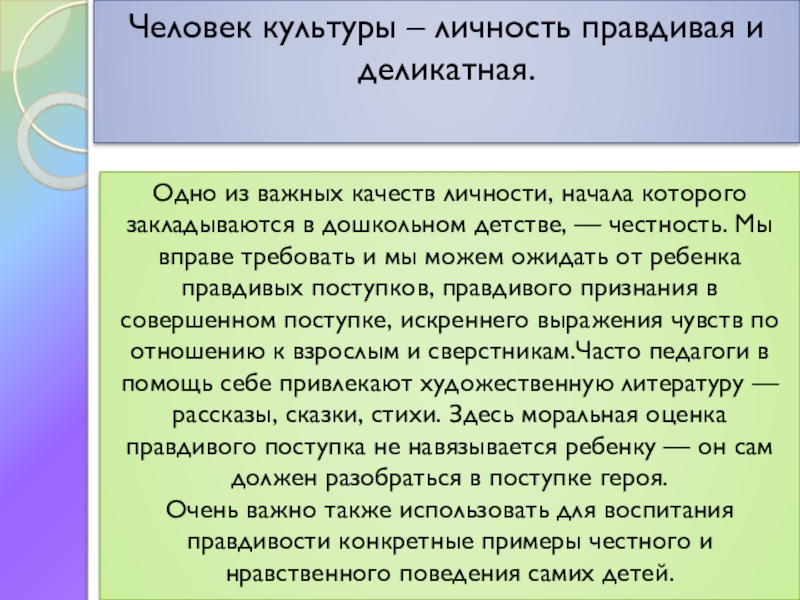 Слайд 11Человек культуры – личность правдивая и деликатная.