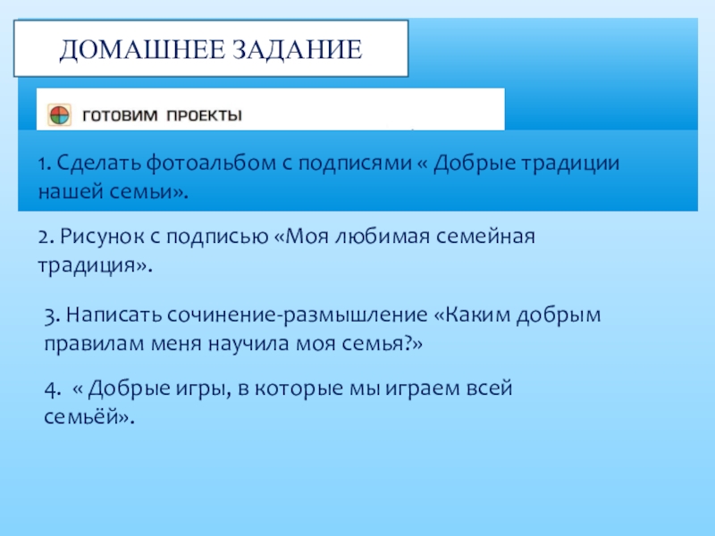 3. Написать сочинение-размышление «Каким добрым правилам меня научила моя семья?»