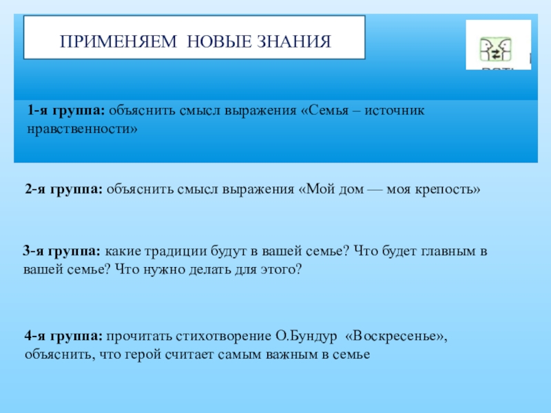 4-я группа: прочитать стихотворение О.Бундур «Воскресенье», объяснить, что герой считает самым важным в семье